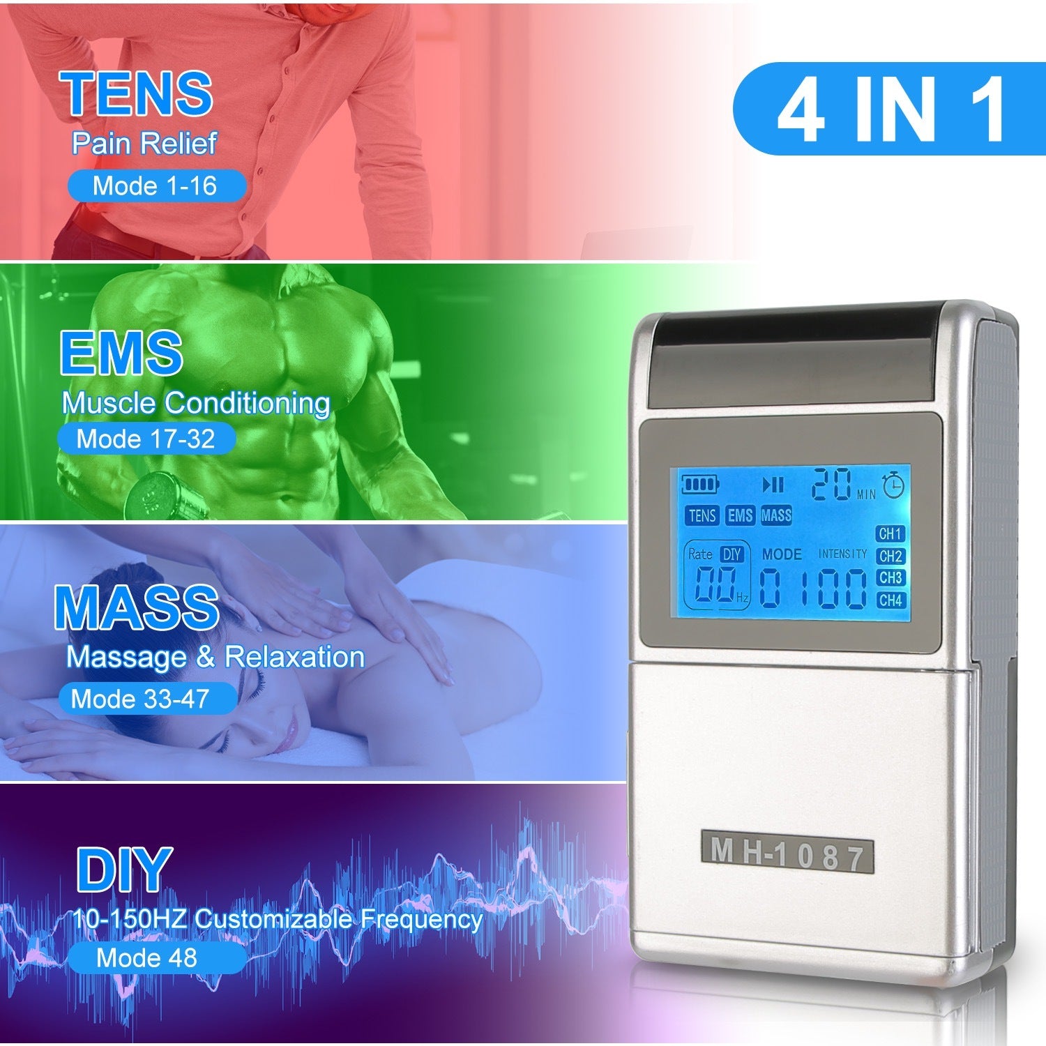 - * 48 Massage Modes & 4 Programs *: This TENS unit provides 48 massage modes and 4 specialized programs:TENS(16 modes for pain relief),EMS(16 modes for muscle conditioning),MASS(15 massage modes for relaxation),and DIY(1 customizable frequency mode). Help you address diverse needs—from pain relief(e.g.,period cramps,sciatica) to muscle training.
