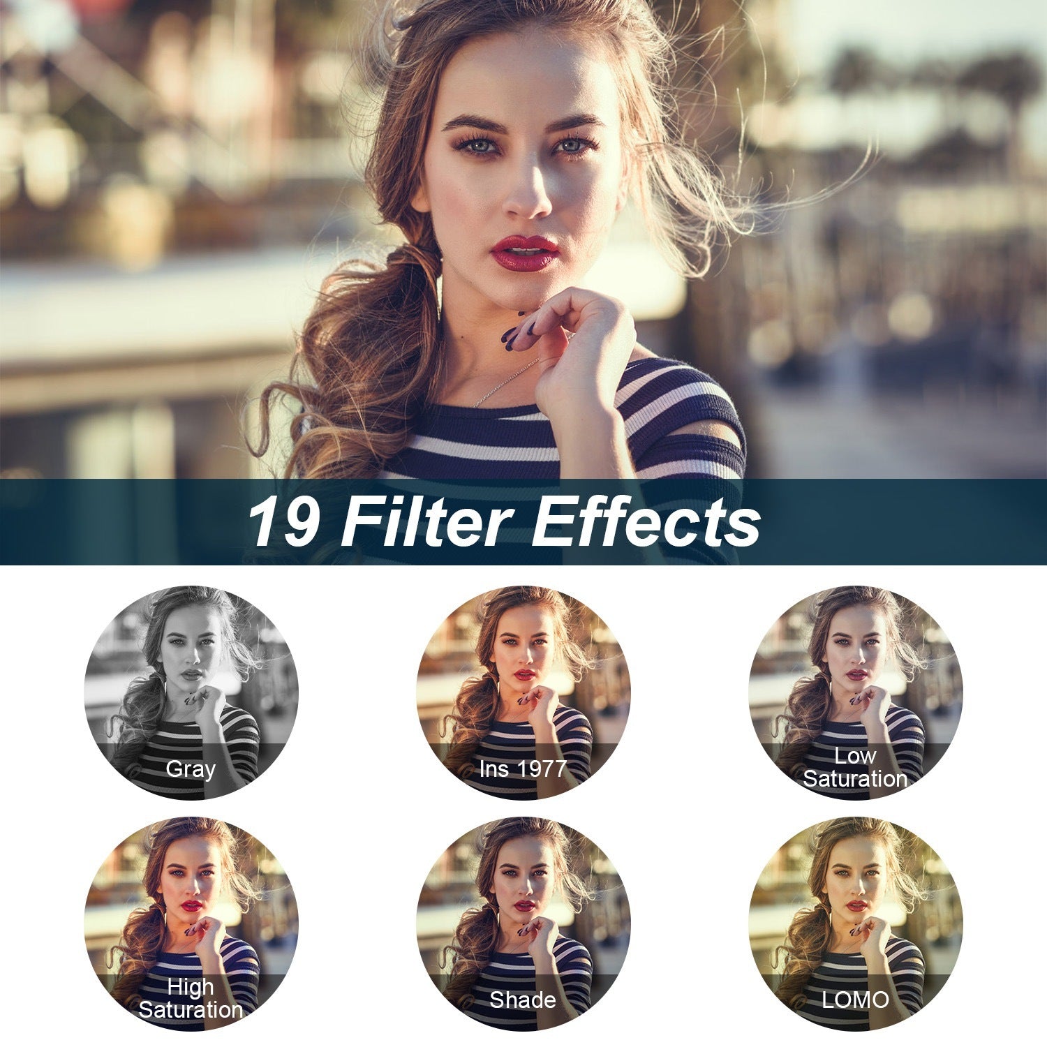 - 19 Filter Effects: None, Gray, Negative, Antique, Red, Green, Blue, Purple, Cyan, Yellow, Ins 1977, Binaryzation, Low Saturation, High Saturation, LOMO, Halo, Cross Printing, Shade, Japanese Color
