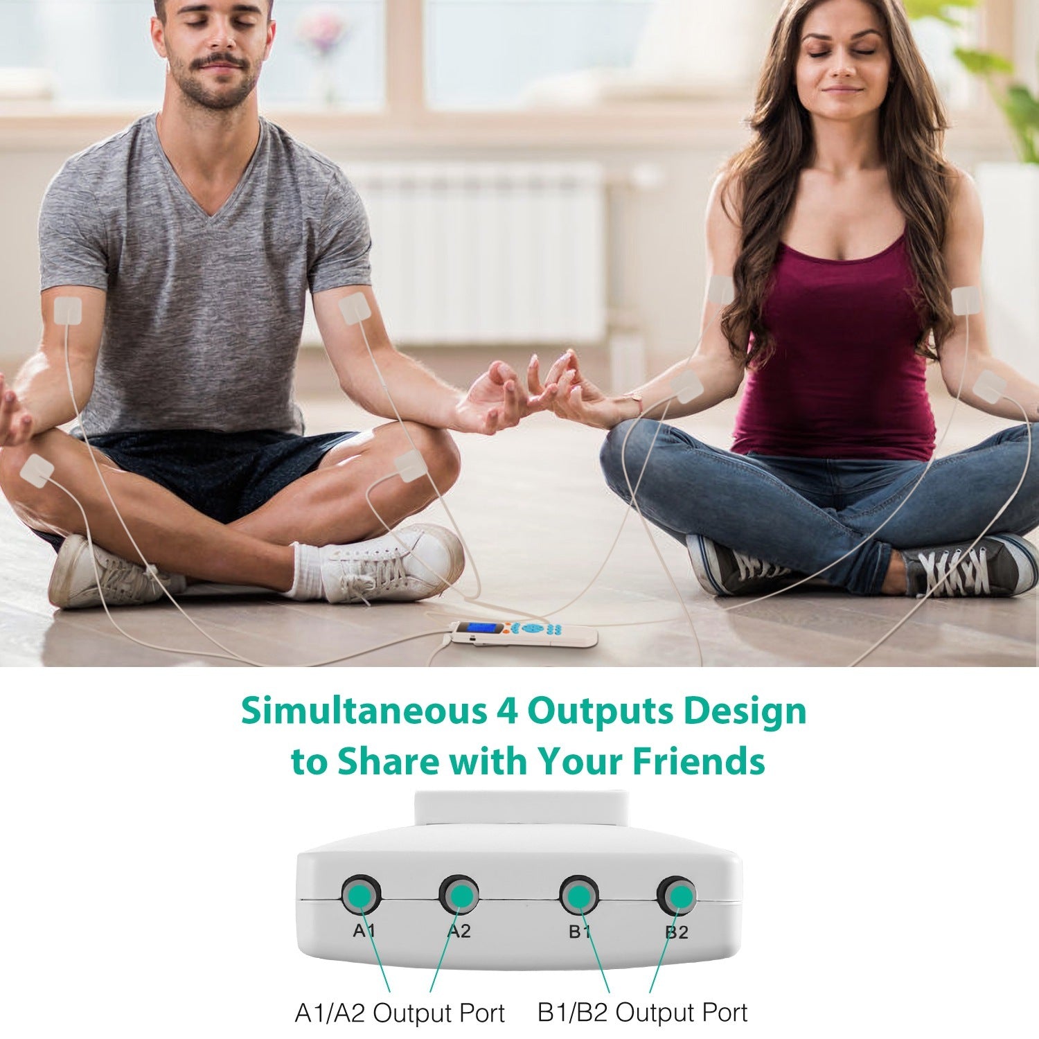 - * Simultaneous 4 Outputs Design to Share with Your Friends *: Designed with 4 wire sets and 4 output ports,8 electrode pads can be used in one person every time or you can share pad sets to your friend.