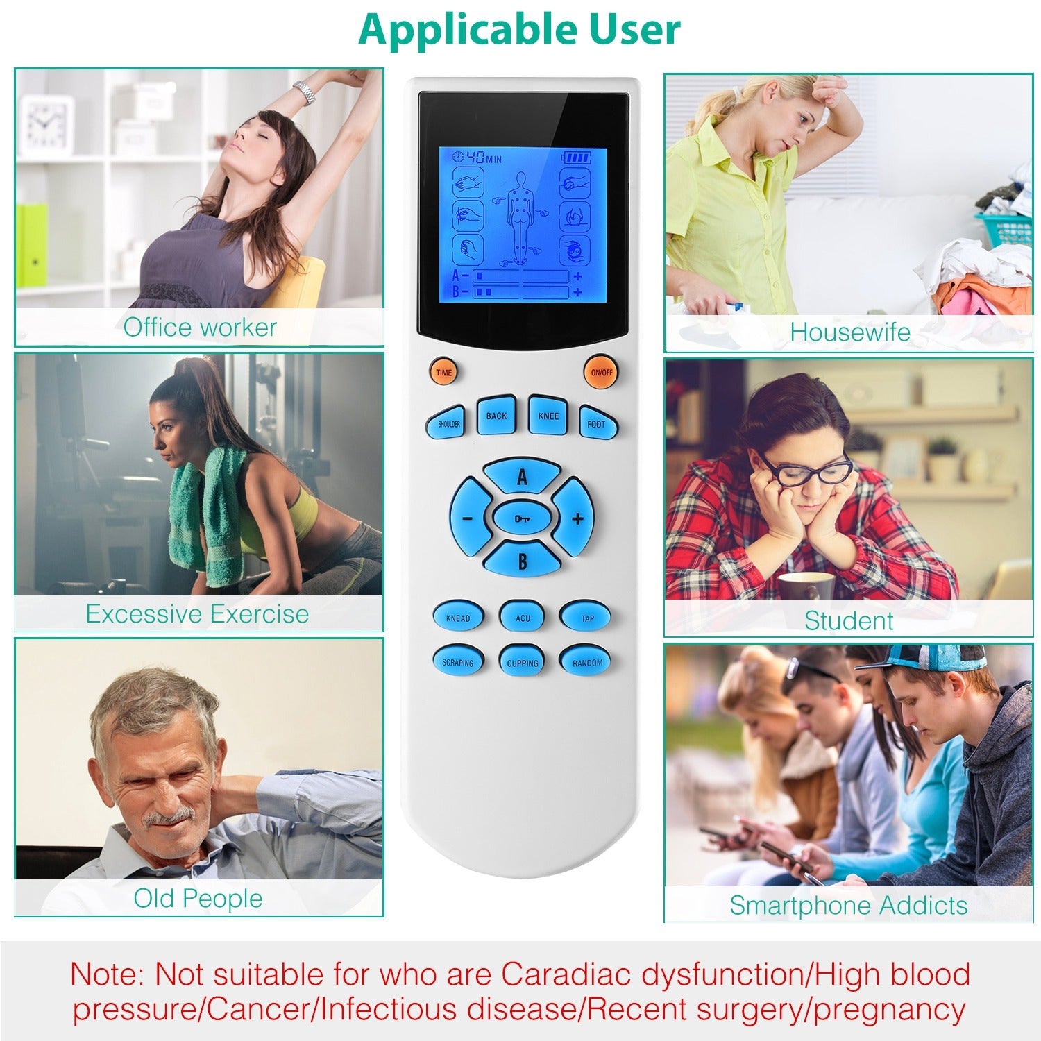 - * 10-60Mins Time Setting and 20-Level Intensity *: Built in timer from 10 to 60 mins with 20 minutes default timer. You can increase or decrease the duration according to your demands. Press twice of+/- to increase/decrease one cell,represents 2-level intensity to increase or decrease. Pre-programmed adjustable timer and intensity makes it much easier to use than other traditional electric therapy products which you need to set the pulse frequency and duration of each pulse manually. Note:Start from the lowest intensity level for your comfort.