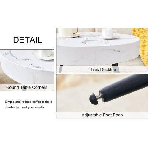 Product Name:31.5" White Marble-Patterned MDF Round Coffee Table with black Metal Legs.Adjustable Feet,Coffee table,Round Table Design,MDF Material,White Marble Pattern.