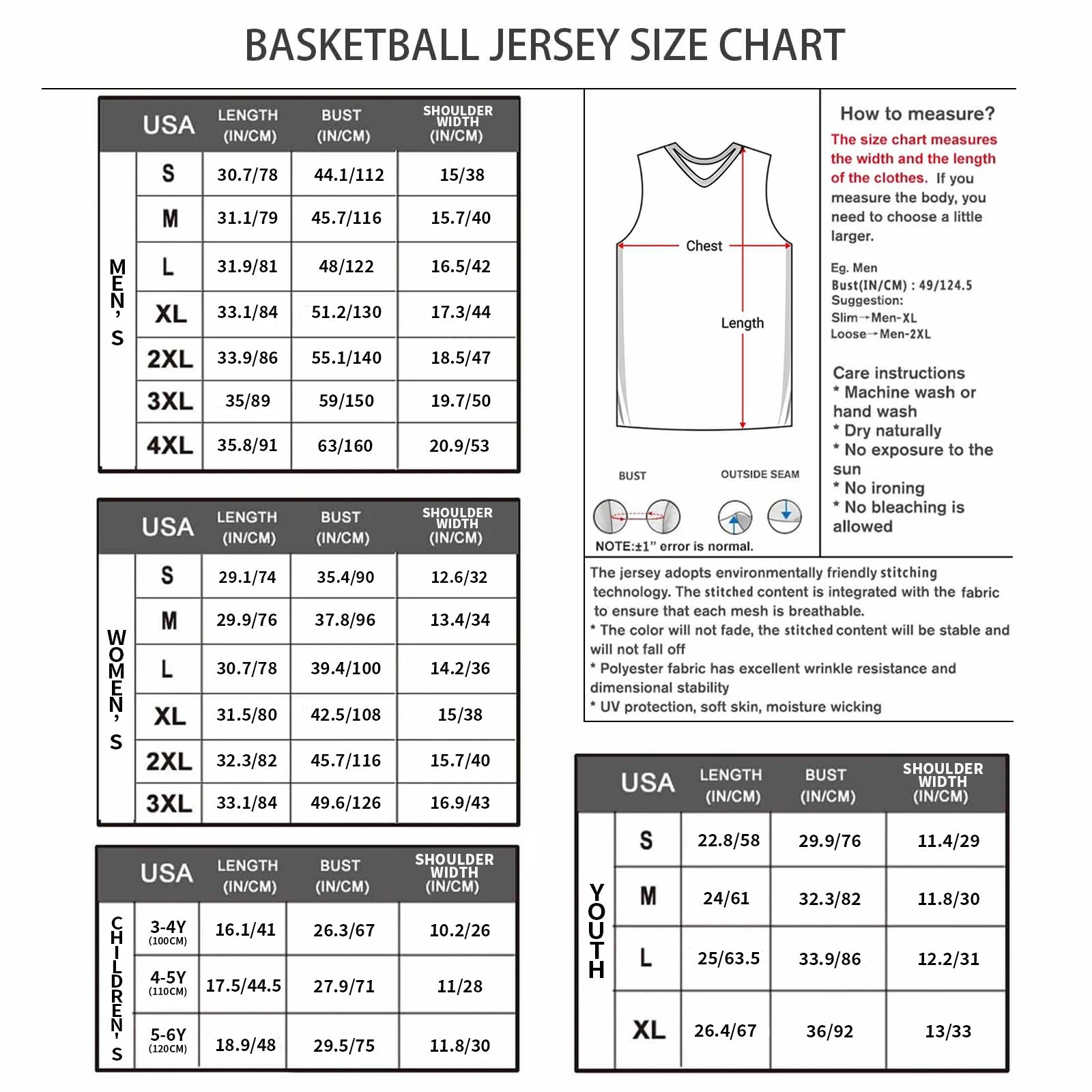🏀【Available in Multiple Sizes】We offer a variety of sizes for men (S-4XL), women (S-3XL), youth (S-XL), and children (3-6Y). All sizes are in U.S. measurements, so make sure to check the size chart to find your best fit.