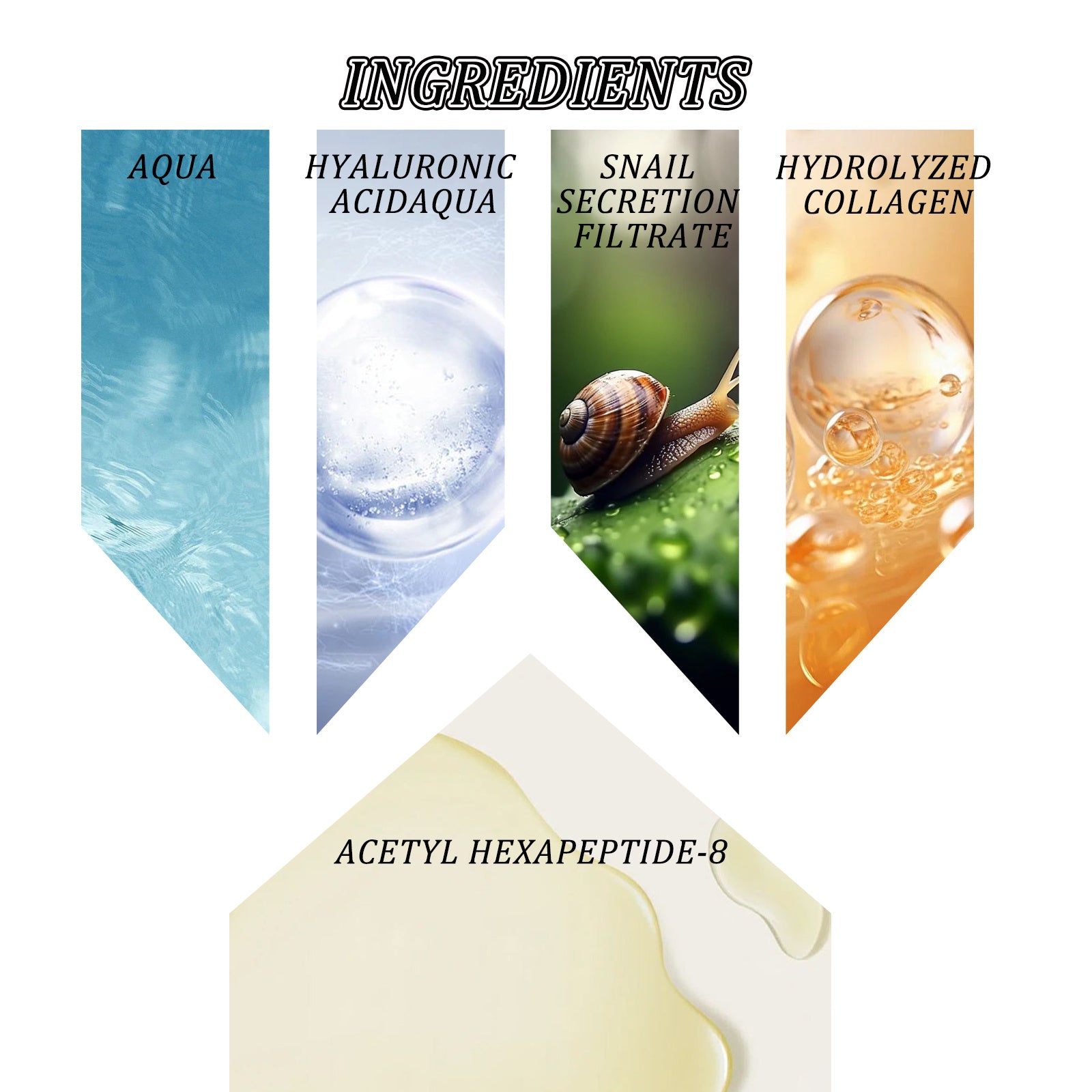 Our Snail Peptide Eye Cream contains hyaluronic acid, snail secretion filtrate, and hydrolyzed collagen.It soothes puffiness and bags under the eyes smoothes fine lines, firms the eye area, replenishes the eye area with the moisture and nutrients it needs, prevents dryness and keeps the eye area moisturized.It is very simple to use: clean under the eyes, take an appropriate amount of eye essence, gently rolling massage with a roller, and then gently tapped with fingertips to absorb.It firms the skin around the eyes and slows down skin aging.
