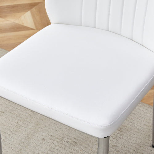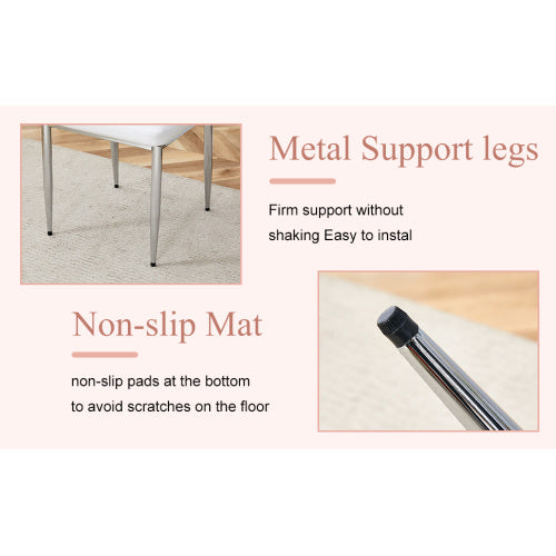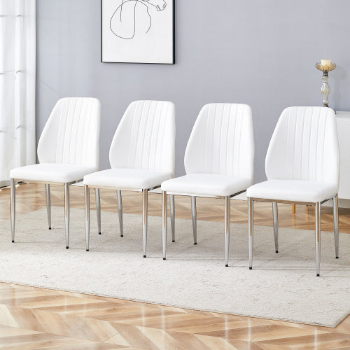Product Name:Set of Four White PU Comfort Dining Chairs (17.7"x25").Dining chair with extended backrest,WHITE PU,Silver metal legs,Suitable for various places such as family restaurants, hotels, coffee shops,etc.