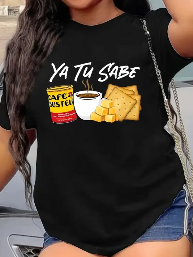 Short Sleeve Women's Summer Crew Neck Fashionable Casual T-Shirt With Coffee & Letter Print