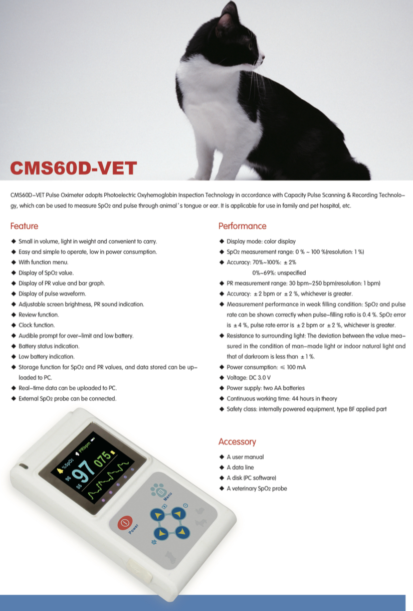 CMS60DVET Pulse Oximeter adopts Photoelectric Oxyhemoglobin Inspection Technology in accordance with Capacity Pulse Scanning & Recording Technology, which can be used to measure SpO2 and pulse through animal’s tongue or ear. It is applicable for use in family and pet hospital, etc.